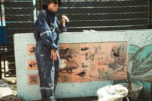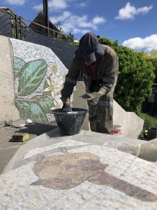 Con todos los materiales producidos en los talleres —dibujos, notas, fotografías y registros de especies— la Colectiva elaboró dos bosquejos que guiaron la creación final: un mural de mosaico en vidrio de 20 m² armado en el taller de los muralistas y luego instalado por partes en la pared de una escalera de la costanera.