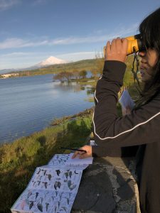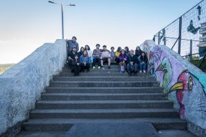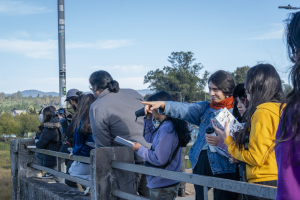 Para crear colectivamente el imaginario del mural fueron necesarias varias instancias. El ciclo comenzó con un taller de observación en terreno impartido por la Colectiva Ko Habitantes en mayo. Allí, los estudiantes recibieron herramientas para realizar un monitoreo comunitario del humedal urbano. Primero tuvieron una sesión en sala y luego, con sus libretas en mano, registraron especies y comportamientos en un recorrido por la costanera, desde las letras Villarrica hasta el embarcadero. Los estudiantes fueron acompañados por Daniel Salvo, profesor de Ciencias del Colegio Altas Cumbres.