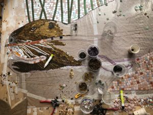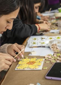 En el cierre del proceso formativo con los estudiantes, la Colectiva Tierra Húmeda desarrolló un taller de mosaico experimental, donde los jóvenes transformaron sus apuntes y dibujos en piezas elaboradas con la técnica de mosaico indirecto. Esta es una técnica artística en la que las piezas del mosaico no se pegan directamente en el lugar final, sino que se arman primero en otro soporte y luego se trasladan completas a su ubicación definitiva.