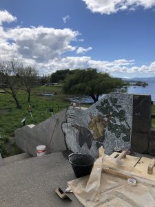 Alejandra Íbañez, en la ceremonia de entrega del mural a la comunidad, leyó una poesía reflexiva que había preparado para la ocasión planteando la necesidad de hacerse presente de reconstruir el tejido de la vida del que los seres humanos somos parte “Cada una, cada uno es un trocito de este vivir, somos partes de este mundo biodiverso Hualas, pilo pilo, juncos, rayaditos y caiquen. humanos, coipos y peces.. el Mallolafken, esa isla y este gran volcán..juntos somos un gran mural viviente que une humedales, que reúne saberes, que vitaliza el cemento cansado y cansador. El pulso creativo nos invita a querer que ese cemento se vuelva aves, qué retome su lugar, ser planetas de greda y poleo”